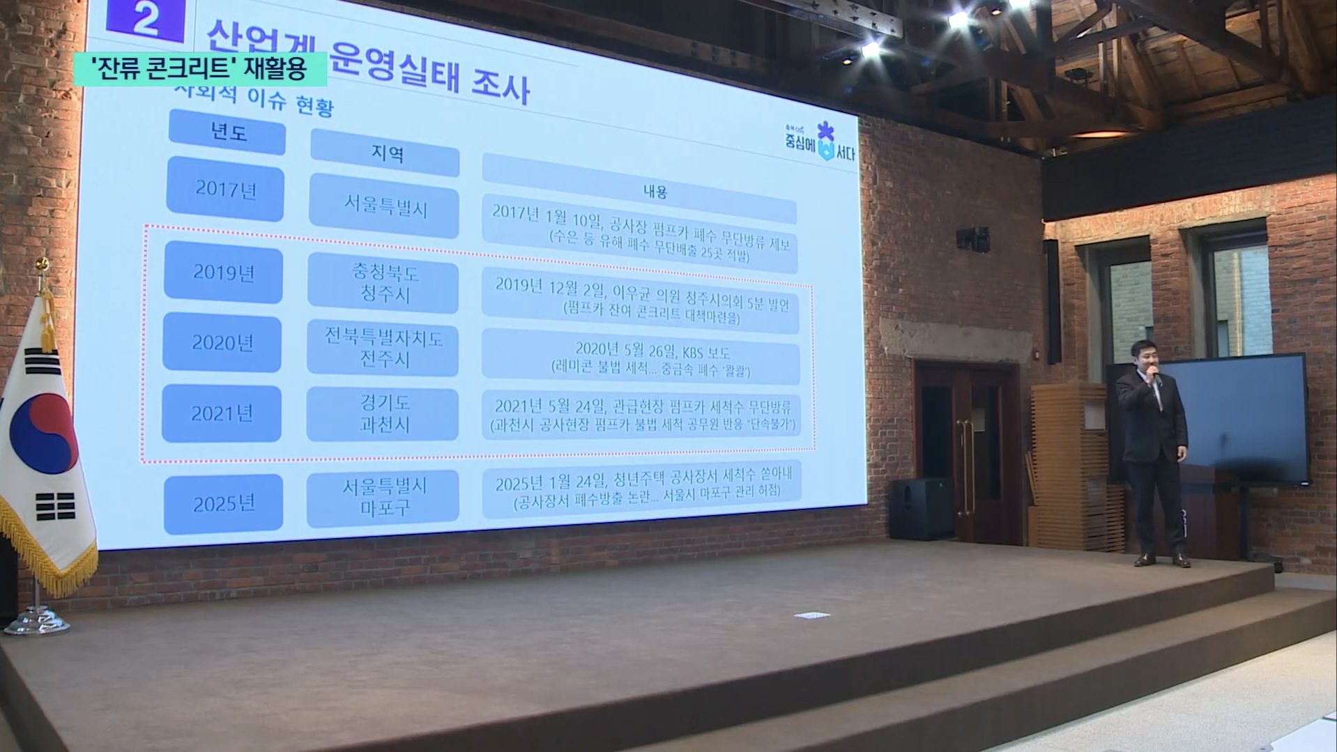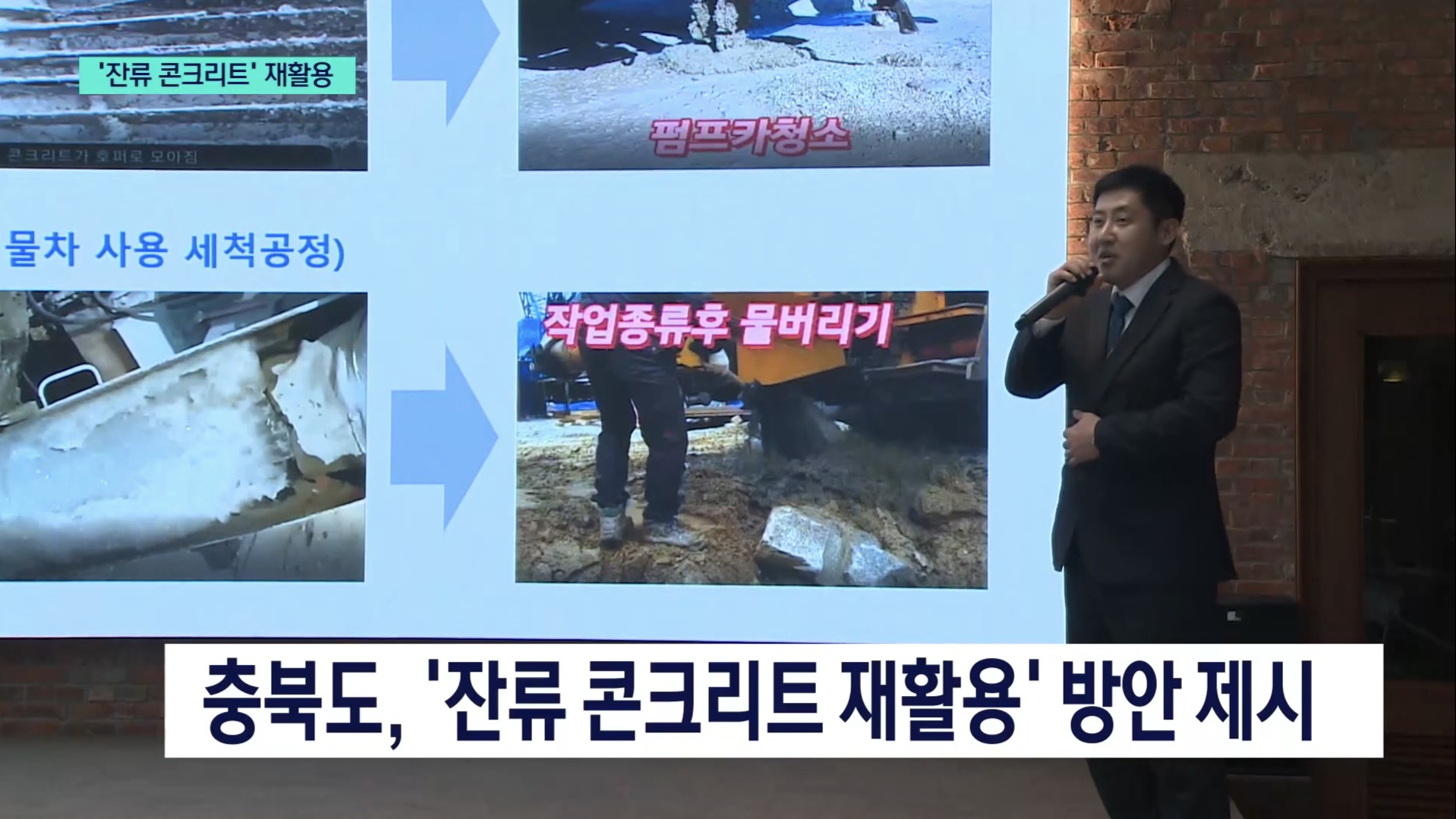 충청북도와 협조하여 그동안 전국적으로 문제가 되어온 '펌프카 잔류 콘크리트' 처리체계를 개선해 처리체계 구조를 합리화하고 콘크리트 제품 제조업에서 원료로 재활용할 수 있도록 제도개선을 완료하였습니다.